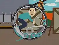 Meanwhile, Mr. Garrison, annoyed and fed up with the inefficient and incompetent airline check-ins since 9/11, decides to invent his own vehicle. Inspired by watching Enrique Iglesias' sexualized singing on TV and by a gyroscope sitting next to him on his deck, he invents the gyroscope-powered monowheel "IT." According to Mr. Garrison, "IT" can "go up to two hundred miles per hour, and gets three hundred miles to the gallon". The only problem is that "IT" is controlled through a quite painful and unappealing method: using four "flexi-grip handles" that somewhat resemble erect penises; two held in the hands, one in the mouth, and a fourth handle which is inserted into the anus. Garrison invites many important investors to see his demonstration of "IT". Despite this unorthodox control mechanism, "IT" is still considered better than dealing with the airlines and Garrison's creation is a smashing success. This results in a lack of passengers and business in airports.