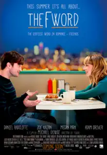 The F Word (released in some countries as What If?) is a 2013 romantic comedy film directed by Michael Dowse from a screenplay written by Elan Mastai, based on the play Toothpaste and Cigars by TJ Dawe and Michael Rinaldi.[5] It stars Daniel Radcliffe and Zoe Kazan as two young people who meet and, because she has a boyfriend, decide to be "friends". Megan Park, Adam Driver, Mackenzie Davis, and Rafe Spall appear in supporting roles.