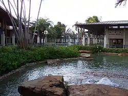 The Falls opened in 1980 as an upscale, open-air plaza. As its name implies, the center is designed around a lushly-landscaped man-made lagoon featuring numerous pools, waterfalls and bridges accented with modern sculpture pieces and decorative lighting. In 1984 the first anchor store, Bloomingdale's, was added, bringing the center to 450,000 ft². Bloomingdale's closed their two-story store temporarily in September 1992 after the store was severely damaged by Hurricane Andrew, but it later re-opened in late 1993, as a three-story Bloomingdale’s. Macy's opened a store in 1996 during an expansion that doubled the size of the shopping center. The center features an iconic tower sign on the southwestern corner of South Dixie Highway and S.W. 136th Street (Howard Drive). The success of the center has led to the surrounding Howard, Briar Bay and Colonial Palms neighborhoods to be encompassed by the generic "The Falls" name.