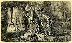 In one of the fable's alternative versions, the farmer takes the snake home to revive it and is bitten there. Eustache Deschamps told it this way in a moral ballade dating from the end of the 14th century in which the repeated refrain is "Evil for good is often the return."[6] William Caxton amplified this version by having the snake threaten the farmer's wife and then strangle the farmer when he tried to intervene.[7] In still another variation, the farmer kills the snake with an axe when it threatens his wife and children. La Fontaine tells it thus as "Le villageois et le serpent" (VI.13).[8]