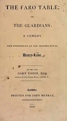 The Faro Table is a comedy play by the British writer John Tobin. First written in the late 1790s it was initially agreed to be staged by Richard Brinsley Sheridan, the manager of the Theatre Royal, Drury Lane who then pulled out of the arrangement. Possibly this was because the character Lady Nightshade was too obviously based on Lady Sarah Archer, one of the Faro Ladies.[1] It drew inspiration from Sheridan's The School for Scandal and particularly the character of Sir Oliver, who is here renamed Barton [2] Around the time Tobin died of consumption he enjoyed great success with The Honey Moon leading to greater demand for his unstaged works.