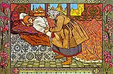 Professor Jack V. Haney stated that the tale first appeared in printed form in 1795,[14] with the title "Сказка о финифтяном пёрушке ясного сокола".[15] In this tale, a king has three daughters, the youngest called Marya Premudraya (Marya the Wise). One day, he has to go on a journey and asks what gifts he can bring them: the elder two ask for pretty dresses and Marya for the bright feather of a clear falcon, since she knows that Ivan-korolevich has been changed into one. The king gives Marya the feather, which she puts by her window, and Ivan, in bird form, flies in through her window. Later, Marya's sisters go to church and notice her sister is wearing fine dresses, then spy on her inside her room talking to Ivan. Some time later, when Marya is asleep, her sisters place blades and knives on the window, for the next time Ivan flies in. It happens as they plotted: Ivan, in bird form, hurts himself in the blades, writes a farewell message to Marya, and flies away to another kingdom. Marya wakes up, sees the blood on the window and reads his message, then commissions three iron garments, three iron canes and three iron wafers ('prosvir', in the original). Marya begins her quest and passes by the huts of three Baba Yagas spinning on chicken legs. The Baba Yagas tell Marya Ivan is their nephew, and has since married to another person. However, they still help Marya by giving them a silver saucer with a golden egg, a magic tablecloth that makes drinks appear and a towel that summons amusements. The third Baba Yaga advises her to stop by the garden when she reaches Ivan's city, and to trade the three objects for a night with her husband. Finally, Marya reaches another kingdom where Ivan-korolevich rules jointly with an Empress. Marya goes to the Empress's gardens and draws out the wonderful objects to attract the attention of the Empress. The woman goes to talk to Marya and wishes to have the objects, but Marya makes a deal: each object for one night with Ivan (the saucer and egg on the first day, the tablecloth on the second, and the towel on the third). To hinder Marya, the Empress tries to make Ivan drunk by giving him enough beverages, but he avoids her trap and pretends to fall asleep. Meanwhile, Marya tries to wake him up on the first two nights, but only manages it on the third. They talk the whole night and, the next day, Ivan takes Marya to his court. He then asks the assembled noblemen which woman he should keep: one that endured dangers and risked her life to find him, or one that sold him? The noblemen reply the first one, and Ivan leaves with Marya.[16]