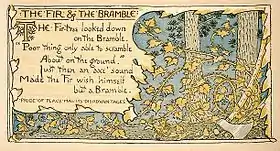 William Caxton (1484) was the first to provide an English version, taking the story from Avianus and giving it the title The busshe and the aubyer tree.[4] In John Ogilby's verse edition (1668) the fable is titled The Cedar and the Shrub[5] but most later collections give it as The Fir and the Bramble. In Victorian times the fable's moral was updated to "Better poverty without care, than riches with."[6]