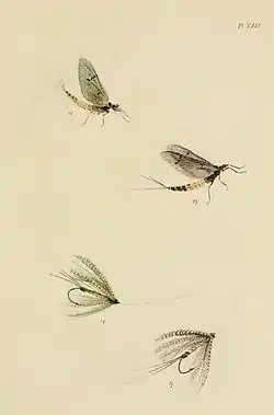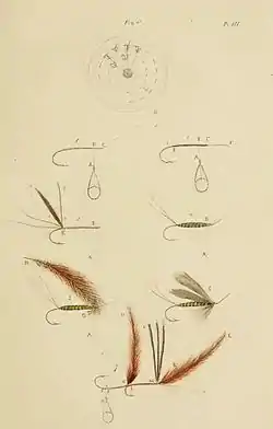 The Fly-fisher's Entomology is the archetype fly-fishing how-to book. Most fly-fishing historians credit Ronalds with setting a literature standard in 1836 that is still followed today.[1] Describing methods, techniques and, most importantly, artificial flies, in a meaningful way for the angler and illustrating them in colour is a method of presentation that can be seen in most fly-fishing literature today. As the name implies, this book is mostly about the aquatic insects—mayflies, caddisflies and stoneflies—that trout and grayling feed on and their counterpart artificial imitations. Less than half the book (chapters I–III) is devoted to observations of trout, their behaviour, and the methods and techniques used to catch them. Most of this information, although enhanced by Ronalds' experiences and observations, was merely an enhancement of Charles Bowlker's Art of Angling (first published in 1774 but still in print in 1836).[2]