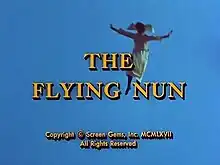 During its first two seasons, The Flying Nun aired on Thursday nights at 8:00pm EST, where the series competed in the ratings with Daniel Boone on NBC and Cimarron Strip on CBS.[11] The show was an instant hit, with high ratings and was declared the "hit of the season;" however, the ratings dropped as the season progressed.[12] During its second year, the series was scheduled against Daniel Boone and Hawaii Five-O. During its final season, the series was moved to Wednesday nights at 7:30pm EST, scheduled opposite The Glen Campbell Goodtime Hour. All of the competing shows ranked higher in the ratings than The Flying Nun, which eventually led to its cancellation. During its three-year run, the series was a part of a three-show comedy block on ABC that also consisted of Bewitched and That Girl.[13] Despite its early popularity, the show's ratings never broke the Nielsen top thirty and the final episode aired on April 3, 1970. However, its 83 episodes have consistently attracted new audiences since its initial run.