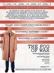 The Fog of War: Eleven Lessons from the Life of Robert S. McNamara is a 2003 American documentary film about the life and times of former U.S. Secretary of Defense Robert McNamara, illustrating his observations of the nature of modern warfare. It was directed by Errol Morris and features an original score by Philip Glass. The title derives from the military concept of the "fog of war", which refers to the difficulty of making decisions in the midst of conflict.