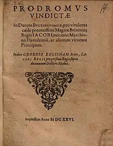 The Forerunner of Revenge, also published in Latin and in German as Prodromus Vindictæ, was a pamphlet accusing George Villiers, 1st Duke of Buckingham of having caused the death of King James I of England by poison. It was written by George Eglisham, who had attended upon King James as a physician, and was first published anonymously with a Frankfurt address.[1] It was in fact printed in Brussels by Jan van Meerbeeck.[2] It contributed to the aura of suspicion that led to the Duke of Buckingham's murder, and was reprinted in 1642 to bring Charles I of England into discredit.[3]