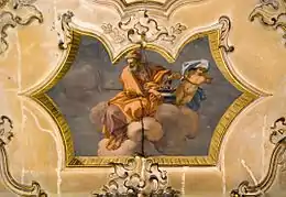 The cycle, completed in 1760, was painted on the Four Seasons Hall vault of the Counts of Isnello palazzo's. It is a graceful example of Palermitan Rococo, that is, late-Sicilian Baroque, fresco cycles.[1] The four paintings are framed in butterfly wing shape, decorative solution adopted at Palazzo Isnello.[2] Among the gilded stucco decoration of the vault there is the artist signature, dated 1760 in golden characters.