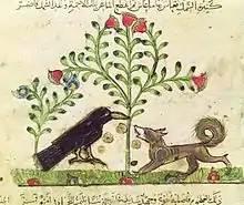 What seems to be a depiction of the tale on a painted vase discovered in excavations at Lothal from the Indus Valley civilisation suggests that the story may have been known there at least a thousand years earlier than any other source.[10] In this scene, the bird is depicted perched on a tree holding a fish, while a fox-looking animal is underneath.[11]