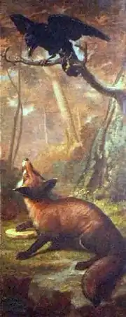 Isabelle Aboulker included the fable among the seven in her children's 'fabl'opera' La Fontaine et le Corbeau (1977) for mezzo-soprano, baritone, children's voices and small chamber orchestra.[21] Jean-Marie Morel (b. 1934) also exploits its dramatic possibilities in what he describes as his small cantata, La Fontaine en chantant (1999), for children's choir and string quartet. David Edgar Walther prefers the term ‘short operatic drama’ for his Aesop's Fables (2009), a 12-minute cycle with libretto by the composer in which "The Fox and The Raven" appears as the first of three pieces. The fable was also choreographed by Dominique Hervieu in 2003 for Annie Sellem's composite ballet project, Les Fables à la Fontaine. In it two dancers perform to a sound fusion score accompanied by video affects.[22][23]