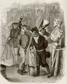 The version in La Fontaine's Fables is told of a fox and a bust (IV.14). However, the fable is merely alluded to in his poem, which is more a meditation on appearance and comments at the end that the fox's remark "to many a lord applies".[7] When the caricaturist J. J. Grandville illustrated the Fables in 1838 he updated the social comment, using animals instead of humans. At an Academy exhibition, a fox glances sideways at a pompous portrait bust that is being examined closely by an ass, with the figures of a uniformed duck and an owlish dandy in the background.