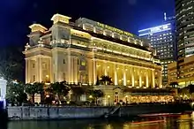 The Fullerton Hotel Singapore is a five-star luxury hotel located near the mouth of the Singapore River, in the Downtown Core of the Central Area, Singapore. It was originally known as the Fullerton Building, and also as the General Post Office Building.[1][2] The address is 1 Fullerton Square. The Fullerton Building was named after Robert Fullerton, the first Governor of the Straits Settlements (1826–1829).[3] Commissioned in 1924 as part of the British colony's centennial celebrations, the building was designed as an office building by Major P.H. Keys of Keys & Dowdeswell, a Shanghai firm of architects, which won the project through an architectural design competition.[4][5][6][7][8] The architectural firm also designed the Capitol Theatre, its adjoined Capitol Building and the Singapore General Hospital.[9] In 2015, it is gazetted as a national monument of Singapore.[10]