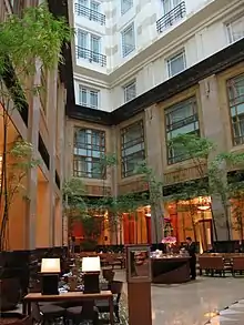 Two parallel sets of guest rooms now ring the hotel's central triangular sky-lit atrium. One row faces out towards the harbour and the tall buildings of the central business district. The rooms of the inner ring have views of the courtyard in the centre of the building. There is an indoor garden over the old Straits Club at the centre of the atrium which can double as a venue for cocktails. The main entrance into the hotel, where dignitaries and celebrities are received, is covered with a large glass canopy at the porch.[5][8][15]