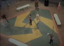 While running among ancient ruins outside the arena, Kirk tries gaining information about the Providers from Shahna, but her collar is activated when she speaks too freely. Kirk protests that he should have been the one punished, and when they are returned to their cells, Shahna expresses her appreciation for this. When she moves to embrace him, Kirk knocks her unconscious, and uses her key to free himself, Uhura, and Chekov, but they are stopped by Galt.