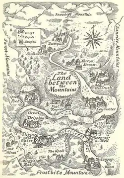 The story starts in a fictional valley named the Land Between the Mountains. It is surrounded by four mountain ranges: Snowdrift to the north, Frostbite to the south, the Sunrise Mountains to the east and the Sunset Mountains to the west. This valley is populated by twelve villages of Minnipins, a race of industrious "little people" rather like hobbits.[4] The novel takes place in a village called Slipper-on-the-Water, in and around the gold mines in the Sunset Mountains and on a nearby knoll where the outlaws live. The date of the story is given as the year of Gammage