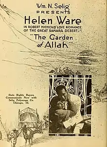 The Garden of Allah is a 1916 American silent drama film directed by Colin Campbell and starring Helen Ware, Tom Santschi and Eugenie Besserer.[1] It is based on the 1904 novel of the same title by Robert Smythe Hichens, adapted a number of times including a 1937 sound film starring Marlene Dietrich. Location shooting took place in the Mojave Desert. A print of the film survives in the George Eastman Museum.[2]