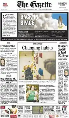 The Gazette is a daily print newspaper and online news source published in the American city of Cedar Rapids, Iowa. The first paper was published as an evening journal, branded the Evening Gazette, on Wednesday, January 10, 1883.[1] The newspaper is distributed throughout northeastern and east-central Iowa, including the Cedar Rapids and Iowa City metropolitan areas. It was formerly called The Cedar Rapids Gazette. As of September 2019, The Gazette has a circulation of 32,616 for the daily edition and 37,860 for the Sunday edition.[2]