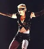 "Like a Virgin" opened the Weimar Cabaret segment: Madonna wore top hat and a tailcoat while singing in the guise of actress Marlene Dietrich, pronouncing the word "virgin" as "wirgin".[37][38][39] "Bye Bye Baby" saw Madonna, Haris, and De Lory performing with three scantily clad women in a choreographed, highly sexual routine.[40] "I'm Going Bananas" was then sung in "Judy Holliday/Betty Boop/Cyndi Lauper-ish vocals."[37] For the next number, "La Isla Bonita", Madonna removed the tailcoat, and performed in a blue and white striped shirt. She sang on top of a rising platform while one of the musicians walked around bare-chested playing the acoustic guitar.[31][36] The final song before the encore was "Holiday"; it featured Madonna and the dancers wearing long trenchcoats and doing a military parade while an American flag was hung in the background.[37][41] The final numbers were "Justify My Love" and a mashup of Sly and the Family Stone's "Everybody Is a Star" (1969) and Madonna's own "Everybody":[36] the former had the singer and dancers wearing Victorian costumes and her holding a lorgnette, and the latter saw them change into white tops and denim shorts.[37] Afterwards, as a red curtain fell and carnival music played, the pierrot emerged yet again, only to reveal its identity as Madonna herself. The singer closed the show by singing the phrase "Everybody is a Star" as the curtain fell once again.[31]