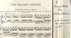With The Mikado drawing large audiences in London and New York, Sullivan began composing The Golden Legend in Yorktown, Camberley, England, on 24 April 1886, and rehearsals began on 10 September 1886.[12] Like Sullivan's other Leeds Festival pieces, such as The Martyr of Antioch, the work was presented on a grand scale, with 325 voices and 120 orchestra players.[13] In addition to the usual orchestra instruments, Sullivan augmented the woodwind section with piccolos, cor anglais, bass clarinet and contrabassoon, cornets in addition to trumpets, and included prominent parts for bells, harp and organ.[14] The festival was held 13–16 October 1886, and the premiere of The Golden Legend took place on Saturday, 16 October 1886; its success with audiences and critics alike was immediate.[15]