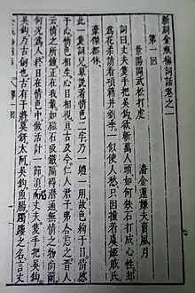 Jin Ping Mei (Chinese: 金瓶梅) — translated into English as The Plum in the Golden Vase or The Golden Lotus — is a Chinese novel of manners composed in vernacular Chinese during the latter half of the 16th century during the late Ming dynasty (1368–1644). Consisting of 100 chapters, it was published under the pseudonym Lanling Xiaoxiao Sheng (蘭陵笑笑生), "The Scoffing Scholar of Lanling,"[1] but the only clue to the actual identity is that the author hailed from Lanling County in present-day Shandong.[2] The novel circulated in manuscript as early as 1596, and may have undergone revision up to its first printed edition in 1610. The most widely read recension, edited and published with commentaries by Zhang Zhupo in 1695, deleted or rewrote passages important in understanding the author's intentions.[3]