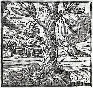 During the vogue for Emblem books in the 16th-17th centuries, the gourd was taken as the symbol of evanescence and became associated with a new version of the fable in which a pine took the place of the palm-tree. Its first appearance was in the Latin poem by Andrea Alciato that accompanied what was to become Emblem 125 (on brief happiness) in his Emblemata.[6] A translation of this runs: 'A gourd is said to have sprung up close to an airy pine tree, and to have grown apace with thick foliage: when it had embraced the pine's branches and even outstripped the top, it thought it was better than other trees. To it spoke the pine: Too brief this glory, for soon to come is that which will completely destroy you - winter!'