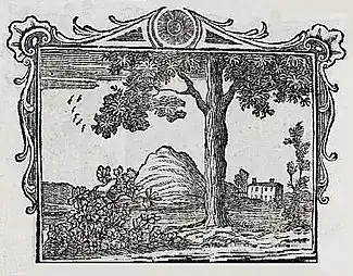 A different device accompanied Johann Ebermeier's treatment of the fable in his Neu poetisch Hoffnungs-Gärtlein (new poetic pleasance of hope, Tübingen, 1653). It stands at the head of a short Latin poem with a longer German translation titled "Like a shadow and a gourd’s leaf is happiness".[9] There was also a Latin prose version of the fable included in the Mithologica sacro-profana, seu florilegium fabularum (1666) by the Carmelite monk Father Irenaeus. There it illustrates the moral that prosperity is short and the story is told of either a pine or an olive tree (seu olae) next to which a gourd grows, only to die lamenting in winter.[10]