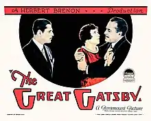 The Great Gatsby is a 1926 American silent drama film directed by Herbert Brenon.[1] It was the first film adaptation of the 1925 novel of the same name by F. Scott Fitzgerald. Warner Baxter portrayed Jay Gatsby and Lois Wilson portrayed Daisy Buchanan.[2] The film was produced by Famous Players-Lasky, and distributed by Paramount Pictures. The Great Gatsby is now considered lost.[3][4] A vintage movie trailer displaying short clips of the film still exists.