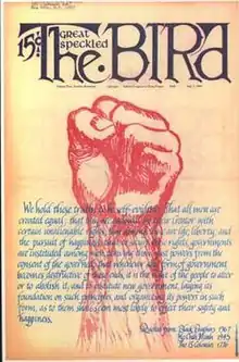 The Great Speckled Bird was a counterculture underground newspaper based in Atlanta, Georgia from 1968 to 1976 and 1988 through 1990.[1][2] Commonly known as The Bird,[2] it was founded by New Left activists from Emory University and members of the Southern Student Organizing Committee, an offshoot of Students for a Democratic Society. Founding editors included Tom and Stephanie Coffin, Howard Romaine and Gene Guerrero Jr.[3] The first issue appeared March 8, 1968, and within 6 months it was publishing weekly. By 1970 it was the third largest weekly newspaper in Georgia with a paid circulation of 22,000 copies. The paper subscribed to Liberation News Service, a leftist news collective. The office of The Great Speckled Bird at the north end of Piedmont Park (240 Westminster Dr.) was firebombed and destroyed on May 6, 1972.[4] In a letter to the editor of the New York Review of Books, Jack Newfield et al. note that the bombing occurred after the paper published an exposé of the mayor of Atlanta.[5]