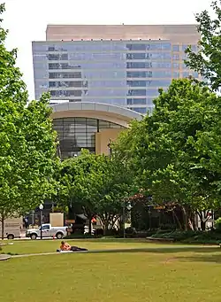 The Green is a one and a half acre park at 400 South Tryon Street in uptown Charlotte, North Carolina.[1] At one end of this so-called pocket park are the Mint Museum and the Bechtler Museum of Modern Art; at the other end is the Charlotte Convention Center.[2] Next to it stands Charlotte's historic St. Peter's Catholic Church. The Green is the site of various public events, such as movie screenings and free plays, including summer performances by the Charlotte Shakespeare Festival.[3] This park is frequently the site of public art and sculpture, including three giant computer-timed fish fountains, a popular feature with children in the summer.[4] Mosaic benches and stools are tucked away in shady side paths.[5] Five large sculptures by the French artist Niki de Saint Phalle stood in The Green from January through October 2011.[1][6]