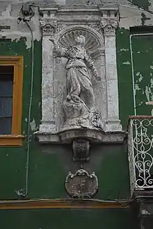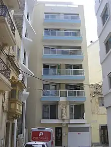 Predominantly on the façade sits a Baroque niche where a statue of the Assumption of Our Lady stands.[3] Being one of the first houses to be built in the area, the integral niche gave the name to the street that is found at, as St Mary Street. The later name was likely given as a consequence of the building being visible from different points of the street, which like the name of the house may origin from the residents's given reference.[4] The building is, however, addressed at No. 1, St Agatha Street, exactly at the cross-section of St Mary Street.[6] The niche received the blessing by Bishop Gaetano Pace Forno,[7] who awarded those who prayed in front of it with indulgences. A date is written on the niche as 1875, which is an approximate indication of when the building was built.[6]