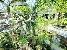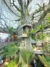 At the centre of the bio-dome, there is an 82-foot (25-meter) tall tree with an artificial trunk. A small bridge connects to the tree, which can only hold up to four people at a time. There is also an artificial waterfall.[8] Visitors enter on the fourth floor via a lift and walk down using a spiral slope. In addition, there is a lift and stairs to access animals in the basement. Reptiles are on display at every level, with information about them.[3]
