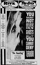 The Haunting opened in New York and Los Angeles on 18 September 1963.[36] Audiences were frightened by it. Film critic Dora Jane Hamblin related how four of her female friends went to see the film, which proved so frightening that afterwards, the group spent fifteen minutes looking for the contents of their purses, which had spilled onto the floor over the course of the movie as the women jumped out of their seats from fear.[37] In Houston, Texas, a local cinema promoted the film as so chilling that it held a contest to see which of four patrons could sit all the way through a midnight screening; the prize was $100.[38] Despite these stunts, The Haunting was only an average success at the box office.[39]