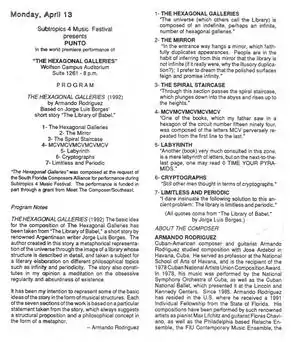 Based on a short story by Jorge Luis Borges, this piece was commissioned by the South Florida Composers Alliance and premiered at the Wolfson Campus Auditorium of the Miami Dade Community College in Miami, Florida, on 13 April 1992.[1] The Hexagonal Galleries is comprised by seven sections named as follows: