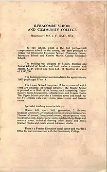 Originally opened by then Education Secretary Margaret Thatcher in 1970 and known as Ilfracombe School & Community College, it was the first purpose-built comprehensive school in the country. Subsequently, it was called Ilfracombe College. Since the early 1980s, facilities available to students have included a television studio with an editing suite. The buildings were designed by Messrs & stillman,[1] Following fundraising and negotiations from 2001, the college was awarded specialist college Media Arts status in 2004 and was renamed Ilfracombe Arts College. In 2007, the school built a £3.4 million arts block named the Beacon Arts Centre. The arts department relocated to this department, freeing up rooms for other uses in the school. The previous art rooms were refurbished into new administration, student services, and learning support areas. The previous student services were refurbished into a conference room with video conferencing facilities. The school converted to academy status in May 2013, but continues to specialise in the arts.