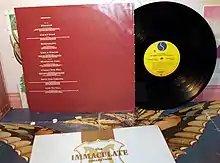 The album was packaged in a gatefold sleeve which did not feature Madonna's image on the cover. Instead, a short haired, brunette Madonna was featured on the two inner sleeves along with lyrics for the two previously unreleased tracks.[8] Photographer Herb Ritts shot the booklet's black-and-white images, which previously appeared on the June 1990 issue of Interview magazine.[18] Madonna continued referencing Catholicism on The Immaculate Collection, dedicating the album to "The Pope, my divine inspiration" on its booklet. This led to many believing it was dedicated to Pope John Paul II, but it was actually dedicated to her brother, Christopher Ciccone, who had spent the year on tour with Madonna on the Blond Ambition World Tour and whose nickname is "The Pope".[19] The album's title is a pun on the Immaculate Conception, a conception of the Virgin Mary without the stain of original sin.[3] In The Everything Mary Book (2006), editors explained "the album's colors of blue and gold resonate with some of the colors used in the traditional images of Virgin Mary".[20] The album was originally titled Ultra Madonna, but the plan was changed as it was too similar to the name of Ultra Naté, a then-new artist in Warner Bros.[21] However, it was marketed in Japan with the title Ultra Madonna: Greatest Hits.[22]