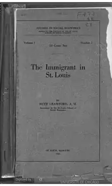 The Immigrant in St. Louis, a survey (published 1916, written by Ruth Crawford) is a non-fiction book that tells of the average's immigrants lives in St. Louis in the early twentieth century. It includes many graphs and tables that details the number of occupations, households in what district, births, deaths, imprisonments, etc. from each cultural group.[1]