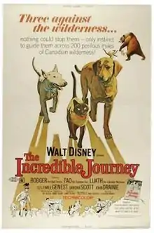 The Incredible Journey is a 1963 adventure film directed by Fletcher Markle and produced by Walt Disney Productions. Based on the 1961 novel of the same name by Scottish writer Sheila Burnford,[2] the film follows the adventure of Luath the Labrador Retriever, Bodger the Bull Terrier, and Tao the Siamese cat as they journey 300 miles (480 km) through the Canadian wilderness to return to their home. The film's human cast consists of Émile Genest, John Drainie, Tommy Tweed, and Sandra Scott, with Rex Allen providing narration.