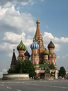 The first churches dedicated to feast of Pokrov appeared in Russia in the 12th century. Probably the most famous Russian church named for the feast day is Saint Basil's Cathedral, Red Square, Moscow, which is officially entitled "the Church of Intercession of Our Lady that Is on the Moat" (Russian: Собор Покрова пресвятой Богородицы, что на Рву) or shortly "Intercession Cathedral upon moat" (Russian: Храм Покрова "на рву").[8] The other one is the Church of Intercession in Bogolyubovo near Vladimir on the Nerl River (Russian: Церковь Покрова на Нерли, Tserkov Pokrova na Nerli). Both churches are on the United Nations' World Heritage List, the latter as part of the site White Monuments of Vladimir and Suzdal. There is also a Church of the Intercession of the Holy Virgin in St. Petersburg.[9]