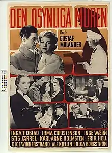 The Invisible Wall (Swedish: Den osynliga muren) is a 1944 Swedish war drama film directed by Gustaf Molander and starring Inga Tidblad, Irma Christenson and Karl-Arne Holmsten. It was made at the Råsunda Studios in Stockholm with location shooting around Kävlinge in Scania. The film's sets were designed by the art director Arne Åkermark. It is based on the 1942 novel Assassination in Paris (Attentat i Paris) by Marika Stiernstedt. It was part of a group of films that dealt with the ongoing theme of the German occupation of Norway and Denmark while being set in a notionally unnamed country.[1]