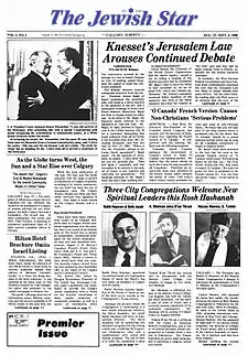 The Jewish Star was a newspaper which appeared in two editions, both produced in Calgary, Alberta, from 1980 to 1990.[1] The fortnightly Calgary edition (ISSN 0228-2283) of The Jewish Star was the first independent Jewish newspaper published in that city; the monthly Edmonton edition (ISSN 0228-6017) of The Jewish Star was the first independent Jewish newspaper published for the provincial capital. Both editions were tabloid-sized newspapers (ranging from 8 to 28 pages per issue) mailed on a controlled circulation basis to virtually all Jewish households in each city.