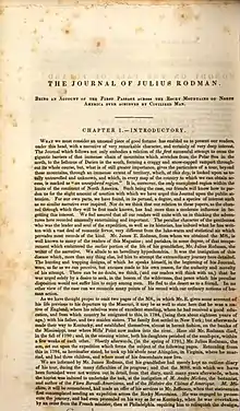The Journal of Julius Rodman is a fictionalized account of the first expedition across the Western Wilderness, crossing the Rocky Mountains. The journal chronicled a 1792 expedition led by Julius Rodman up the Missouri River to the Northwest. This 1792 expedition would have made Rodman the first European to cross the Rocky Mountains. The detailed journal chronicles events of the most surprising nature, and recounts "the unparalleled vicissitudes and adventures experienced by a handful of men in a country which, until then, had never been explored by 'civilised man'."