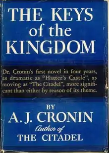 The Keys of the Kingdom is a 1941 novel by A. J. Cronin. Spanning six decades, it tells the story of Father Francis Chisholm, an unconventional Scottish Catholic priest who struggles to establish a mission in China. Beset by tragedy in his youth, as a missionary Chisholm endures many years of hardship, punctuated by famine, plague and war in the Chinese province to which he is assigned. Through a life guided by compassion and tolerance, Chisholm earns the respect of the Chinese—and of fellow clergy who would mistrust him—with his kindly, high-minded and courageous ways.