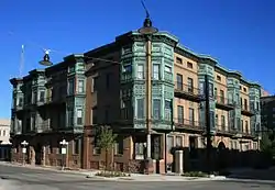 The Kirk was a historic building located in Mason City, Iowa, United States. Completed in 1903, this was the city's first luxury apartment building.[2] Horace P Kirk, who owned and managed the building, was a Mason City businessman, photographer, and civic leader. He built two other buildings here and to the north that were destroyed in a fire in 1902. This building was built on the site of Kirkland Flats, and parts of its stone foundation and north wall may be from the H.P. Kirk wholesale building that had been built in 1892.[2] Originally The Kirk supplied heat, light, and water for the apartments with its own steam generating plant. It has subsequently acquired city utilities. The building features an eclectic design that is organized into horizontal and vertical elements. The horizontal is realized in wide brick bands on the floors. The vertical is realized in the copper-clad oriel windows that tie the second and third floors to the cornice. The building was individually listed on the National Register of Historic Places in 1982,[1] and as a contributing property in the Mason City Downtown Historic District in 2005.[3]