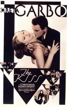 The Kiss is a 1929 American silent drama film directed by Jacques Feyder, starring Greta Garbo, Conrad Nagel, and Lew Ayres in his first feature film. Based on a short story by George M. Saville, The Kiss bears the same title as the 1896 short that "shocked" the American public by being the first motion picture to depict a couple kissing.[1] This 1929 production is notable for being the last major silent film released by Metro-Goldwyn-Mayer (MGM) and the final silent performances by both Garbo and Conrad Nagel. Although this film is not entirely silent, MGM did take partial advantage of the new sound technology and released The Kiss with an orchestral score and sound effects recorded by the Movietone system.[2]