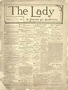 The Lady is one of Britain's longest-running women's magazines. It has been in continuous publication since 1885 and is based in London. It is particularly notable for its classified advertisements for domestic service and child care; it also has extensive listings of holiday properties.
