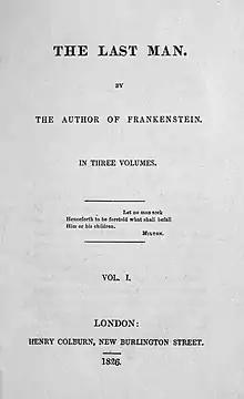 Two editions of The Last Man were published by Henry Colburn in London on 23 January 1826,[17] and one edition in Paris in 1826 by Galignani. A pirated edition was printed in America in 1833.[18] The Last Man received the worst reviews of all of Mary Shelley's novels: most reviewers derided the very theme of lastness, which had become a common one in the previous two decades. Individual reviewers labelled the book "sickening", criticised its "stupid cruelties", and called the author's imagination "diseased".[16] The reaction startled Mary Shelley, who promised her publisher a more popular book next time. Nonetheless, she later spoke of The Last Man as one of her favourite works.