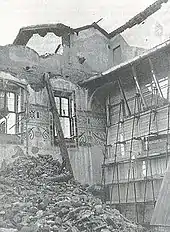 During World War II, on 15 August 1943, the refectory was struck by Allied bombing; protective sandbagging prevented the painting from being struck by bomb splinters,[28] but it may have been damaged by the vibration. Between 1946 and 1954, Mauro Pellicioli undertook a clean-and-stabilise restoration,[12] which Brera director Fernanda Wittgens was involved in.[26] Pellicioli reattached paint to the wall using a clear shellac, making it relatively darker and more colorful, and removed some of the overpainting.[29] However, as of 1972, the repainting done in various restorations had made the heads of saints Peter, Andrew, and James differ significantly from the original design.[12]