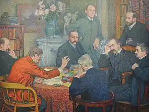 The audience, from left to right, includes Félix Le Dantec, Francis Vielé-Griffin, Félix Fénéon, Henri Ghéon, André Gide, Maurice Maeterlinck, and Henri-Edmond Cross.[2][4][3]