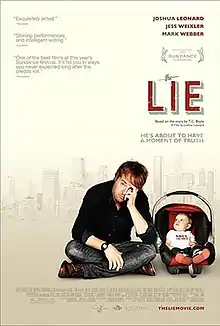 The Lie is a 2011 American drama-comedy film, directed by Joshua Leonard, from a screenplay by Leonard, Jess Weixler, Mark Webber, and Jeff Feuerzeig. It is based upon a short story of the same name by T. Coraghessan Boyle, which was printed in The New Yorker.[1] It stars Leonard, Weixler, Webber, Kelli Garner, Jane Adams, Alia Shawkat, Gerry Bednob, Holly Woodlawn, Kirk Baltz, Tipper Newton and Violet Long.