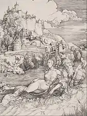 There are parts of the film inspired by both sailors' myths and classical mythology. The fate of the younger lighthouse keeper invokes the myth of Prometheus, as, after finally reaching the light and learning what is in it, he falls down the stairs of the lighthouse and his organs are plucked out by seagulls. On the other hand, the older keeper was modeled on Proteus, a "prophecy-telling ocean god who serves Poseidon", as he "makes that uncannily accurate prediction for how Ephraim will die at the end of the movie"[28] and is even seen with tentacles and sea creatures stuck to his body in one of the younger man's hallucinations. Albrecht Dürer's engraving The Sea Monster inspired Wake's appearance, with Eggers saying: "The Proteus figure that is more clearly nautical is somewhat based on a sea monster by Dürer, who carries a tortoise shell shield."[33] Eggers explained the allusions to classical mythology by saying they are present "Partially because Melville goes there and partially because of I'm sure our unhealthy Jungian leanings".[34]